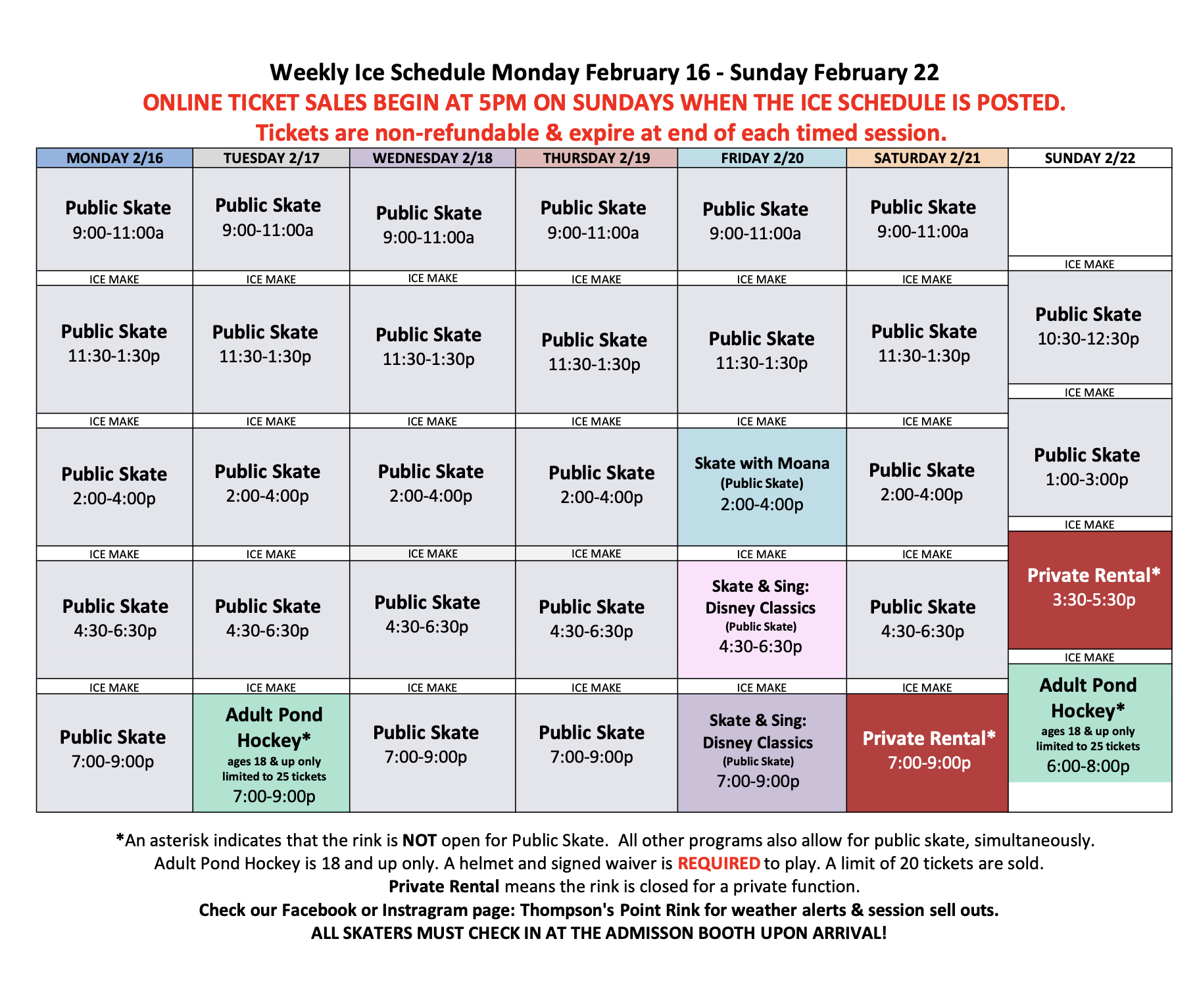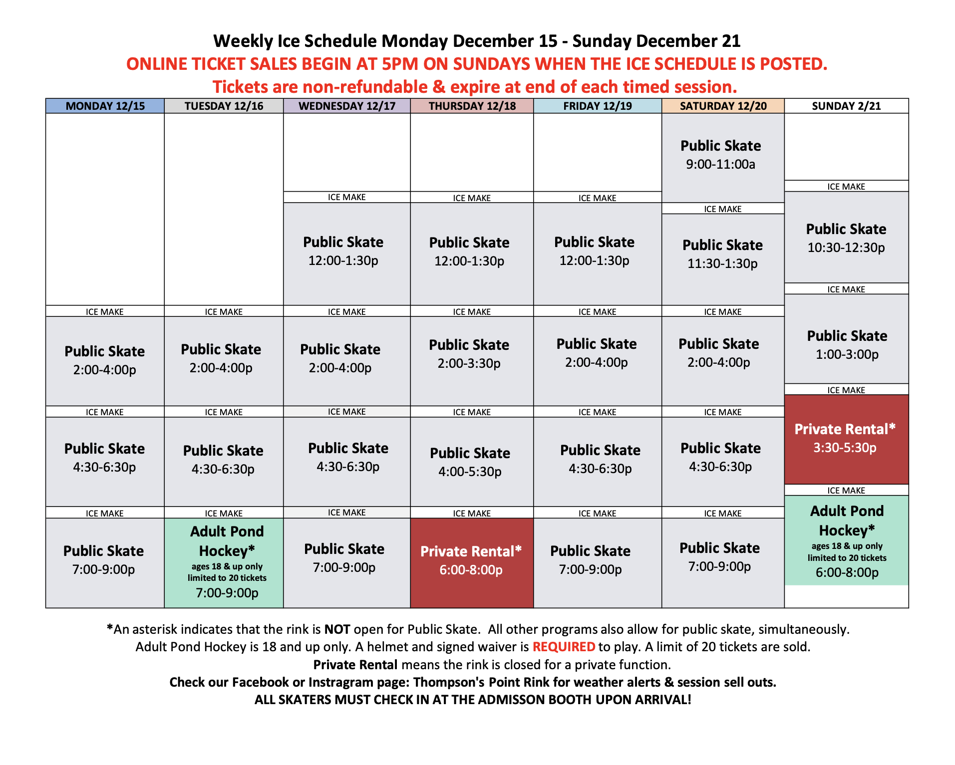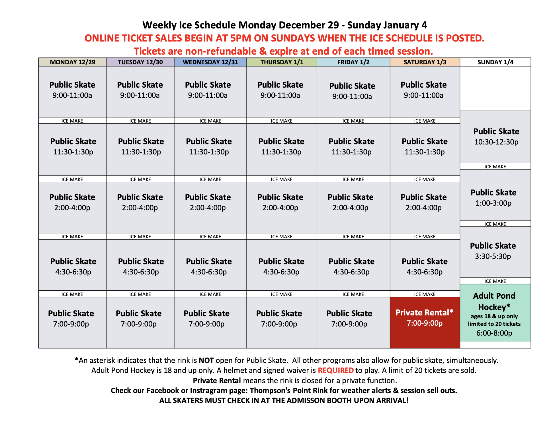 closures or cancellations, please visit the Thompson’s Point Rink Instagram page.